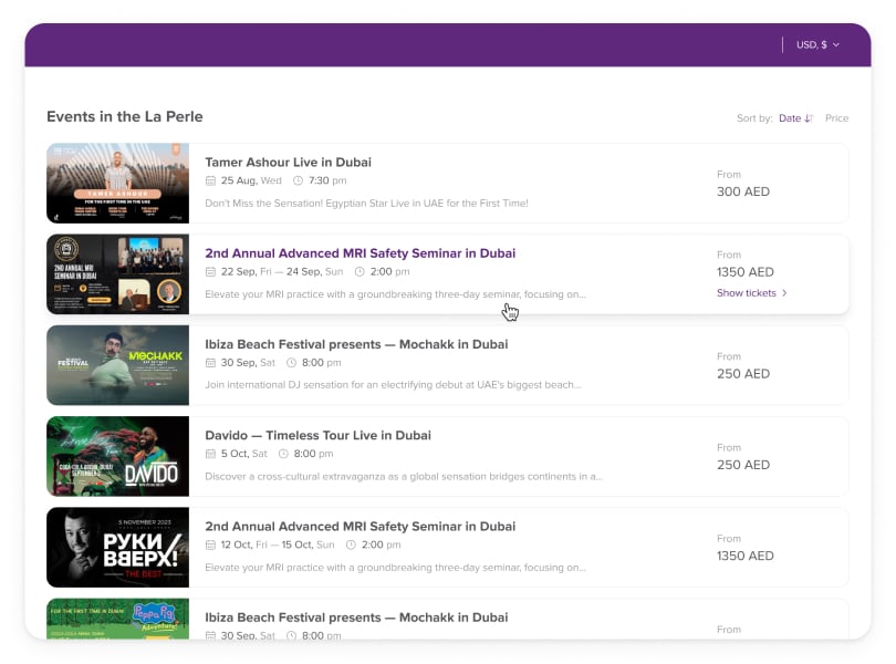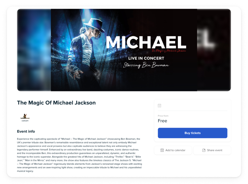 Elevate your ticketing site with advanced search, filters, calendar features, and more. Ideal for managing a multitude of events.