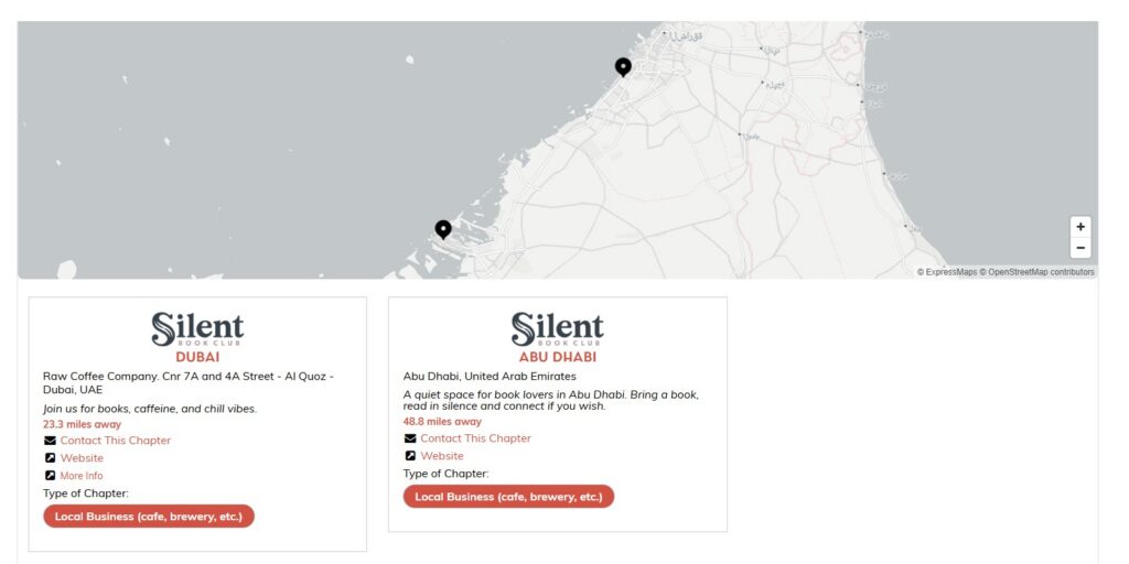 بالنسبة للقراء في الإمارات، يوجد حاليًا مجتمعان لـ Silent Book Club يمكنك الانضمام إليهما: أحدهما في دبي (@silentbookdubai) والآخر في أبوظبي (@silentbookclubad).