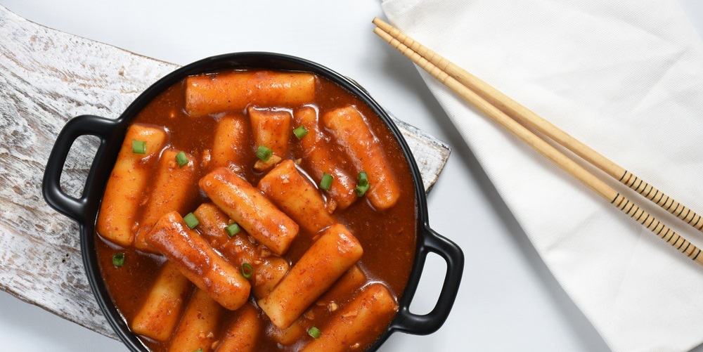 Rice cakes are the base here, along with gochujang (red chili paste), garlic, soy sauce, and a bit of sugar to round it out. You can add fish cakes or eggs if you want something more filling.