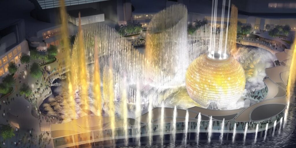 في قلب واجهة المارية البحرية ستكون هناك كرة مضيئة بارتفاع 30 مترًا، محاطة بمياه متدفقة وتقع داخل الخليج. وستحيط بهذه الكرة أكثر من 1,000 نفاثة مياه تعمل بالذكاء الاصطناعي، يصل ارتفاع كل منها إلى 75 مترًا، وستتحرك وفقًا لمقطوعات موسيقية من تأليف رامين جوادي.