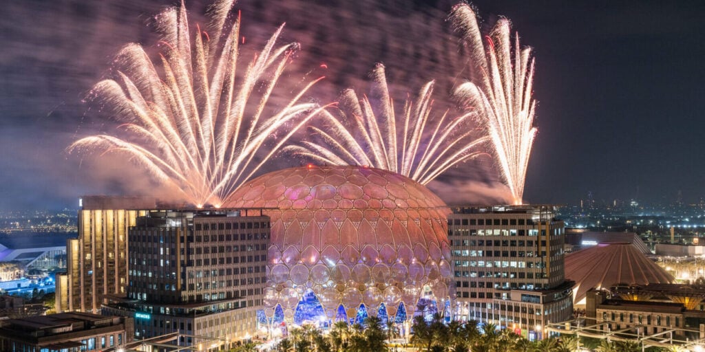 احتفل في ساحة الوصل بمدينة إكسبو مع موسيقى عائلية، عد تنازلي من الكونفيتي، وعرض مذهل للإسقاط على القبة.