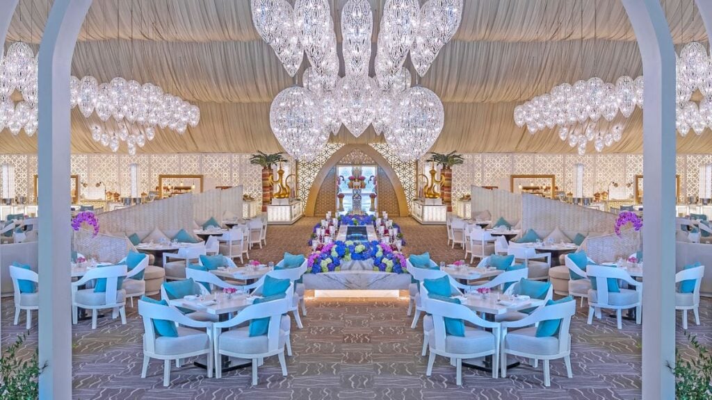 If you love dining under the stars, Palazzo Versace’s Hikayat Ramadan Garden is one of the best Ramadan iftar tents in Dubai. Overlooking Dubai Creek, this outdoor setup is as stunning as it gets. The menu features a mix of international dishes, all carefully prepared by the hotel’s top chefs. Whether you’re here for suhoor or just a laid-back Ramadan evening, the elegant setting makes it a favorite among locals and visitors alike.