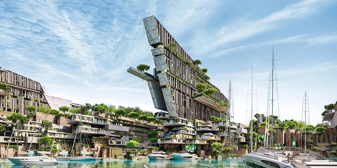 A world hidden inside the cliffs. The entrance begins at a floating marina that leads through an underground canal into a 100-metre-high courtyard open to the sky. Inside are hotels, homes, shops and creative spaces built around a futuristic core known as The Generator.