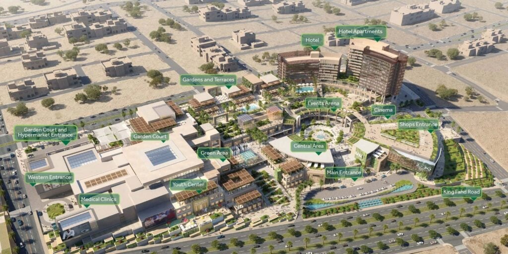 اطلع على تخطيط المشروع مع جميع الأماكن المخصصة للتسوق، والطعام، والترفيه.