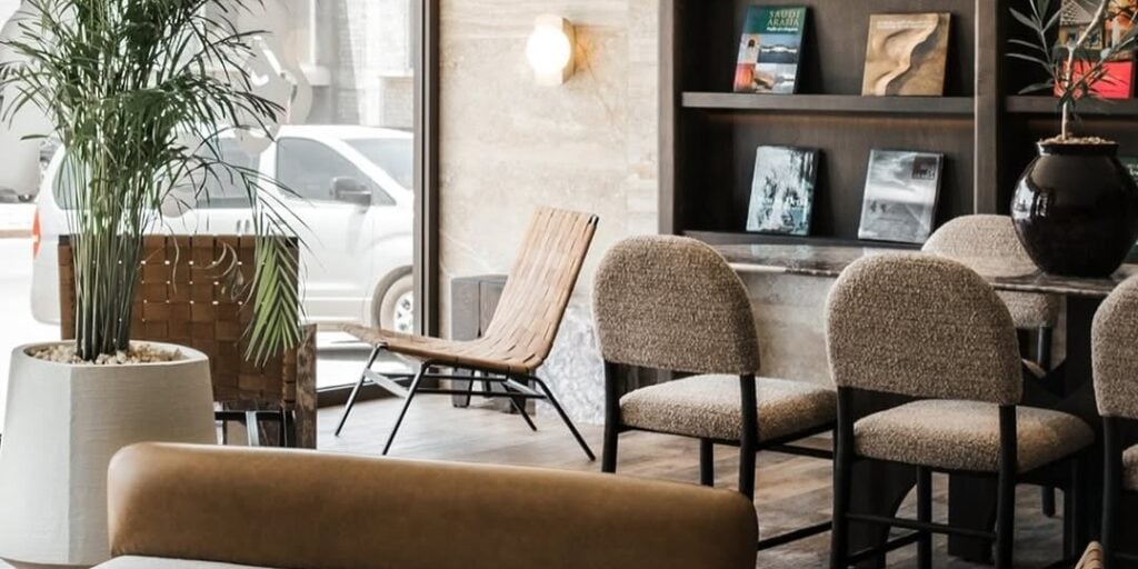 في الداخل، تستمر الأجواء الدافئة مع درجات الخشب الدافئة، والمقاعد المريحة، وبعض النباتات. إنه مكان مريح يجعل من السهل الاسترخاء أثناء احتساء قهوتك.