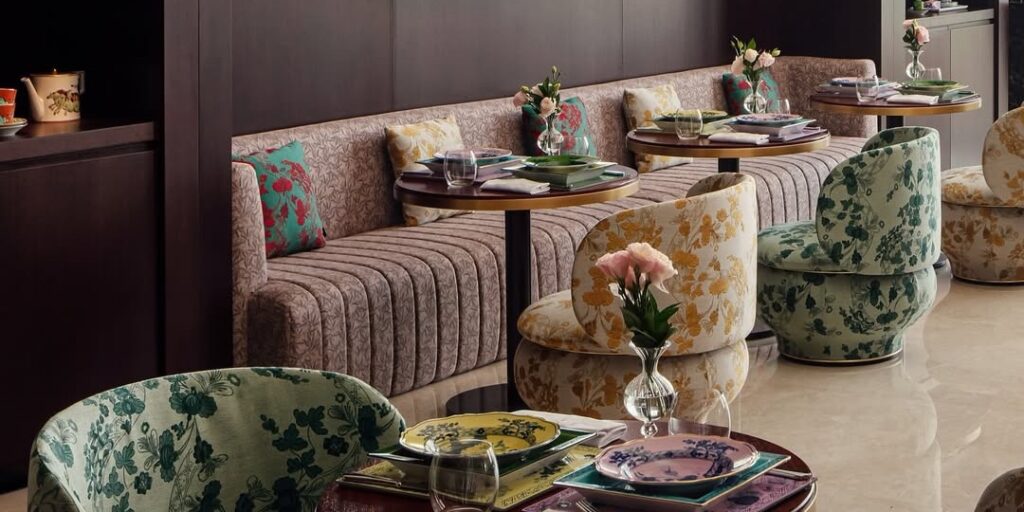 يتميّز التصميم الداخلي للكافيه بعناصر مختارة من مجموعة ديكور المنزل Domus، مثل الوسائد القماشية بألوان Ondori Azalea، وورق الجدران الزهري، وتفاصيل أنيقة تعكس تراث كل من منتجع سانت ريجيس و**جينوري 1735**.