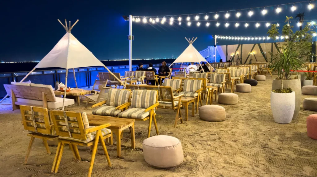تخيل نفسك مسترخياً على كرسي مريح، وقدماك مدفونتان في الرمال وتستمتع بإطلالة خلابة على شاطئ الدمام الممتد أمامك. هذه تكية بحر بالنسبة لك! تضيف المقاعد ذات الطراز البوهيمي لمسة من السحر غير التقليدي، مما يجعلها المكان المثالي للاستمتاع بالطعام الجيد دون إغفال أجواء الشاطئ المريحة.