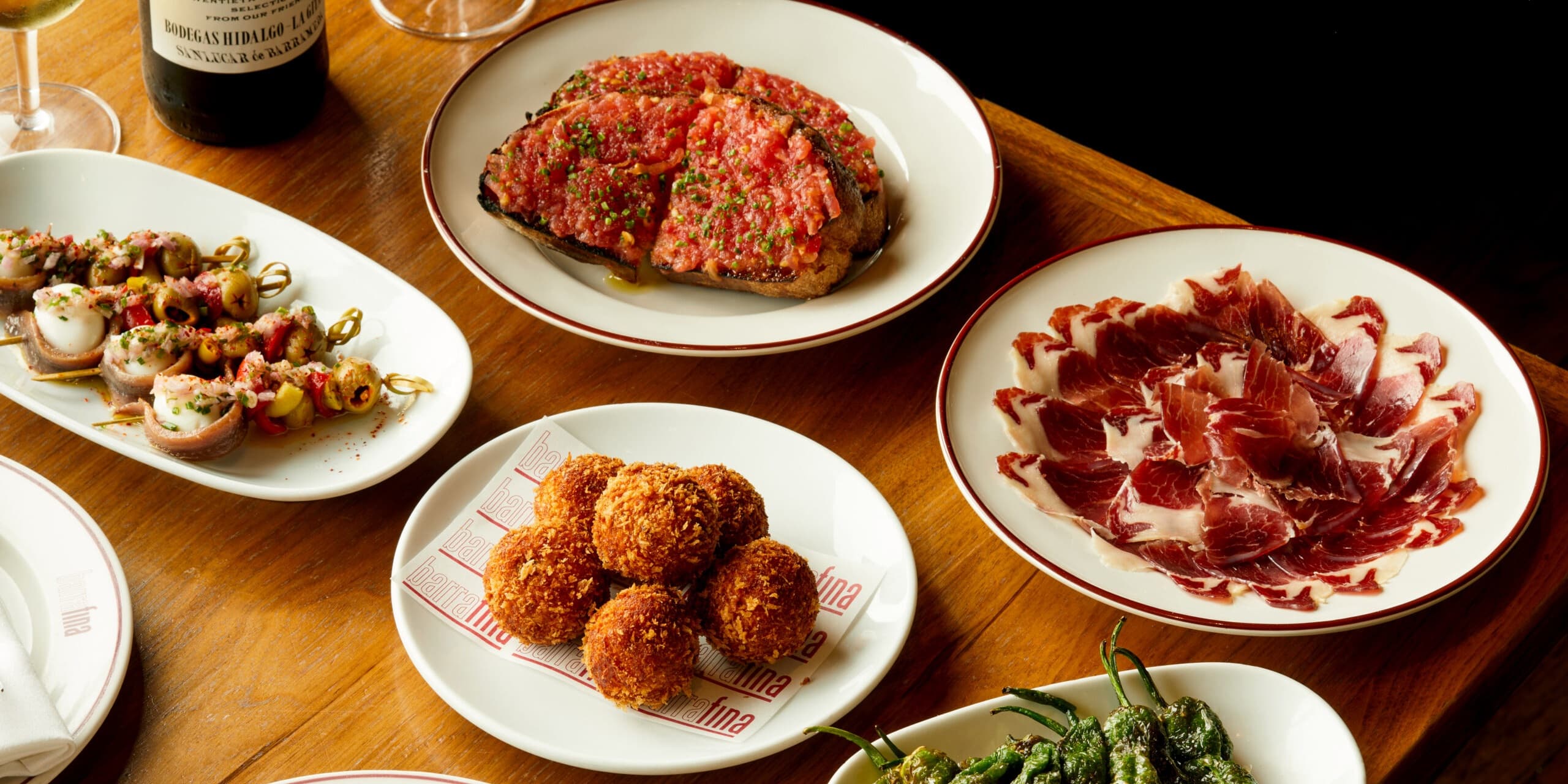 The menu also includes Spanish bikini sandwiches layered with tuna belly and caviar, a good match for terrace seating and a cold drink. Speaking of drinks, the list focuses on Spanish staples, including cavas, sherries, and a small selection of wines.
