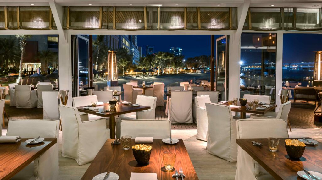 Voted as the “Most Romantic Restaurant in Abu Dhabi,” BBQ Al Qasr offers an enchanting dinner on the beach beneath the stars. With a menu featuring seared steaks and seafood, complemented by billowing white gazebos and golden flickering candles, this beachside gem sets the stage for a truly romantic evening.