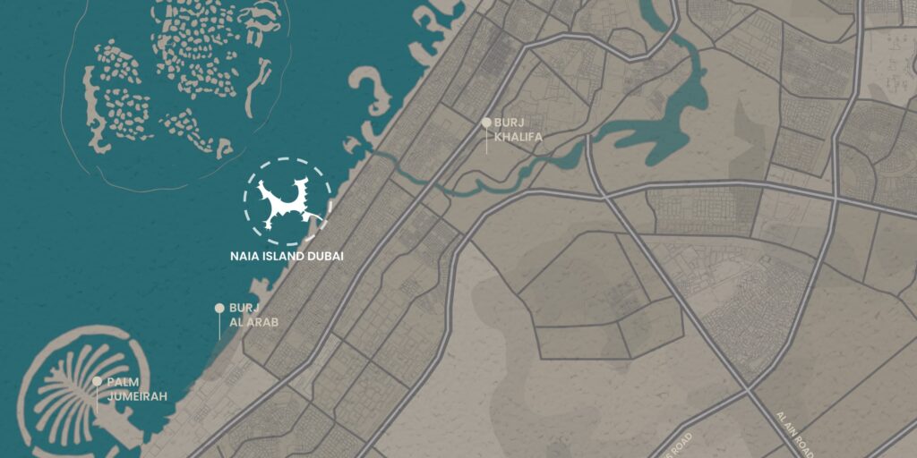 Dubai’s man-made coastline keeps growing. Alongside Palm Jumeirah, The World Islands, and the soon-to-launch Palm Jebel Ali, the city is adding a new name to the list: Naïa Island. The project is developed by Shamal Holding and will be built just off Jumeirah Beach, between Umm Suqeim and Jumeirah 3.