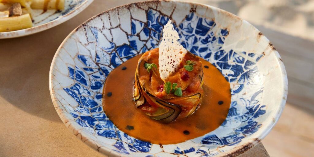 مع غروب الشمس، يتحول شاطئ الريفيرا الفرنسي إلى أجواء الساعة الذهبية. من الساعة 5 مساءً إلى 7 مساءً، يقدمون قائمة خاصة للأبرو – طبقين صغيرين مع كوبين من M de Minuty rosé. اختر من بين لذائذ مثل توست السلطعون الملكي، وسيفيش سمك القاروس، وتارتار اللحم البقري، وتابيناد مع الخبز الدافئ، أو الجمبري المشوي.